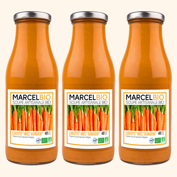 Découvrez notre lot de trois soupes carotte, miel et romarin : une recette gourmande à base de carottes et de patates douces, adoucie par une touche de miel, le tout contrebalancé avec une pointe de romarin.