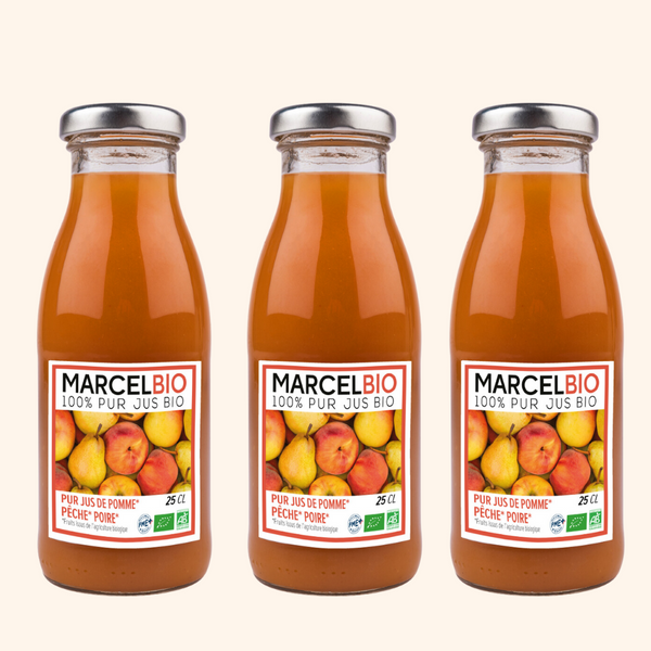 Les Jus Multifruit Marcel Bio sont gourmands et savoureux, élaborés à partir de fruits purs cultivés sans pesticides.