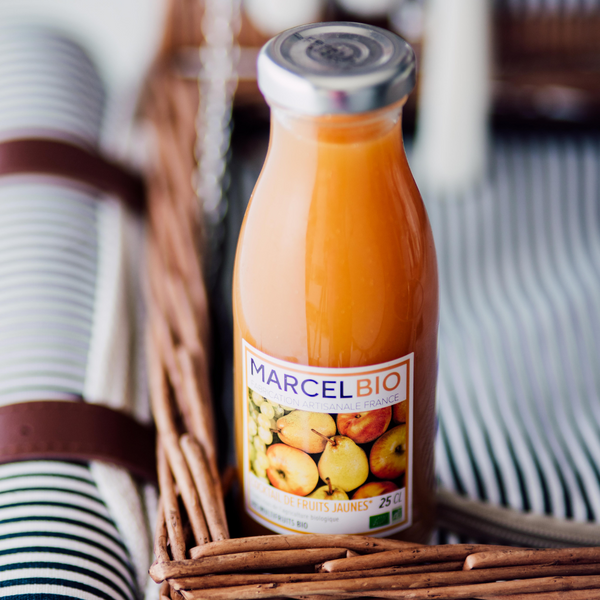 Le Jus Multifruit de Fruits Jaunes Marcel Bio se compose de jus purs et de purées de fruits : pomme, pêche, abricot, raisin blanc et poire issus de l'agriculture biologique.