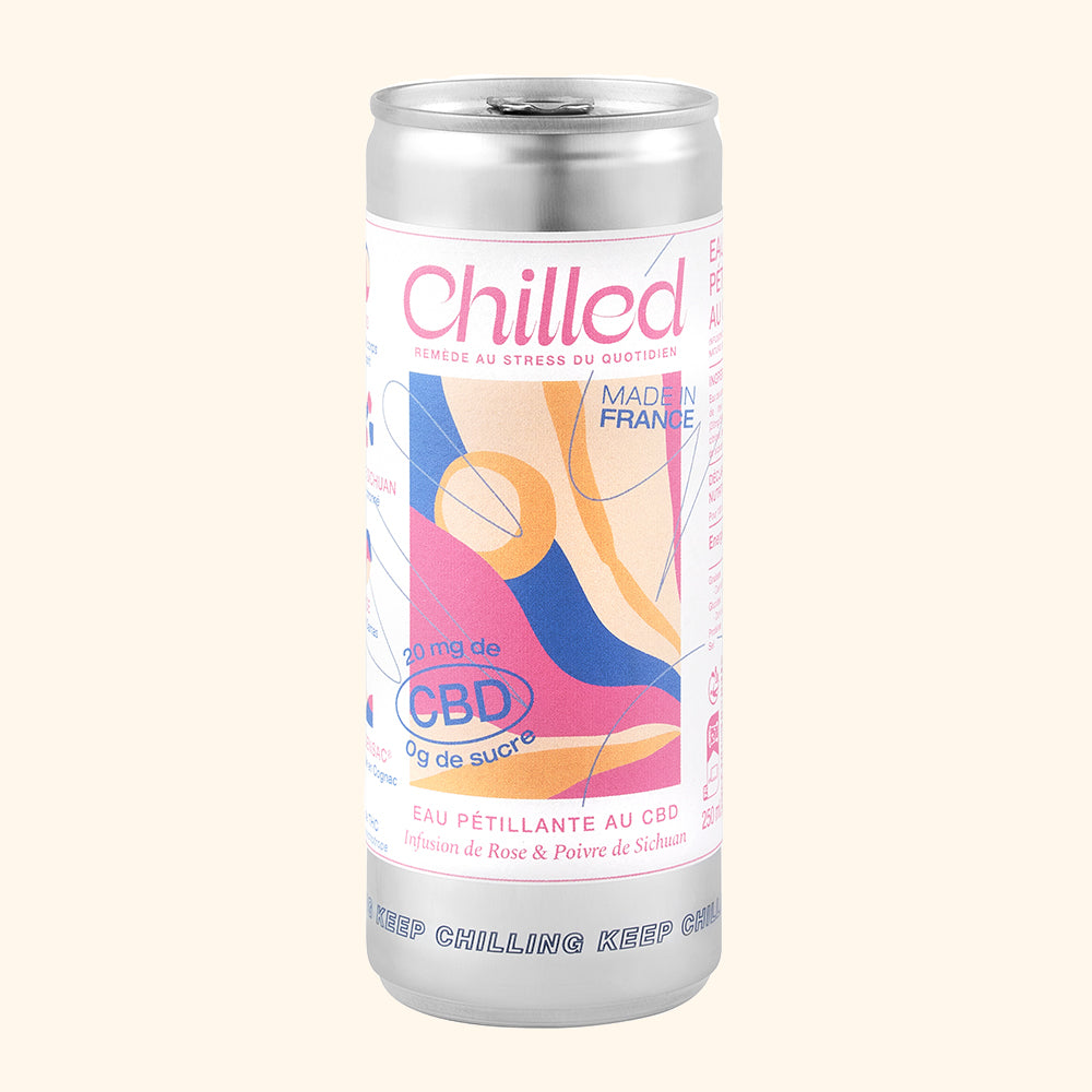 Chilled est la première boisson française au CBD (abréviation de cannabidiol). Une eau de source naturelle issue de montagne autrichienne, pétillante, infusée à la rose et au poivre, qui contient 20mg de CBD par canette de 25cl, zéro sucre et seulement 1 calorie.