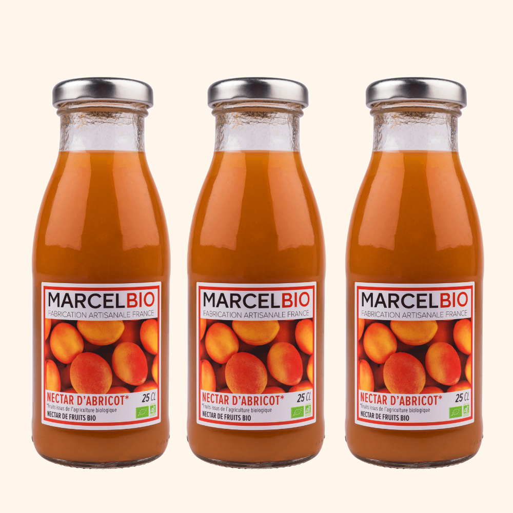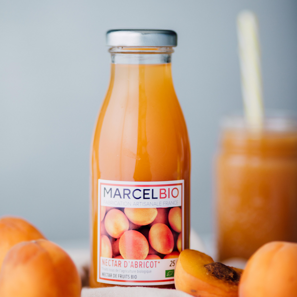 Les nectars Marcel Bio sont issus de fruits bio soigneusement sélectionnés par les agriculteurs partenaires de Marcel. Marcel Bio s’engage auprès de la filière fruit du Languedoc Roussillon à travers un partenariat fort avec les agriculteurs lui permettant de maîtriser ses approvisionnements en pomme, poire, abricot, pêche et raisin Bio d’origine française.
