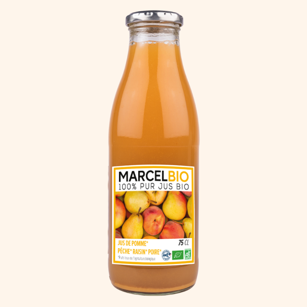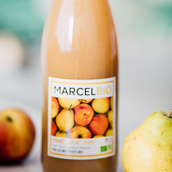 Le jus de pomme, pêche et poire Marcel Bio est 100% pur jus. C’est une recette 100% naturelle et locale.