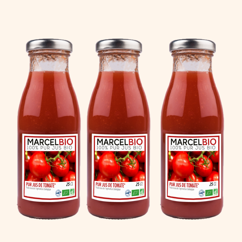 Le jus de tomate Marcel Bio est 100% pur jus. C’est une recette 100% naturelle issue de l'agriculture écologique.