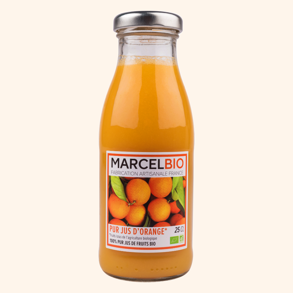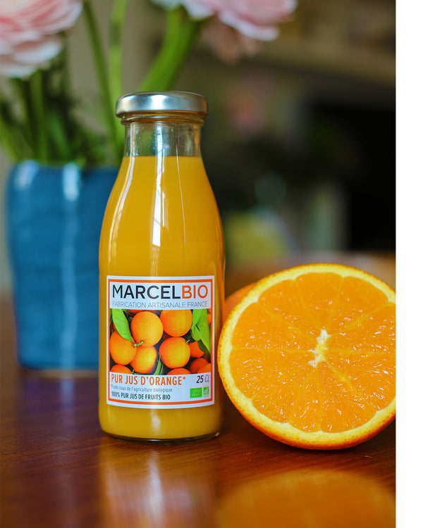 Le jus d'orange sans pulpe Marcel Bio est 100% pur jus. C’est une recette 100% naturelle issue de l'agriculture écologique.